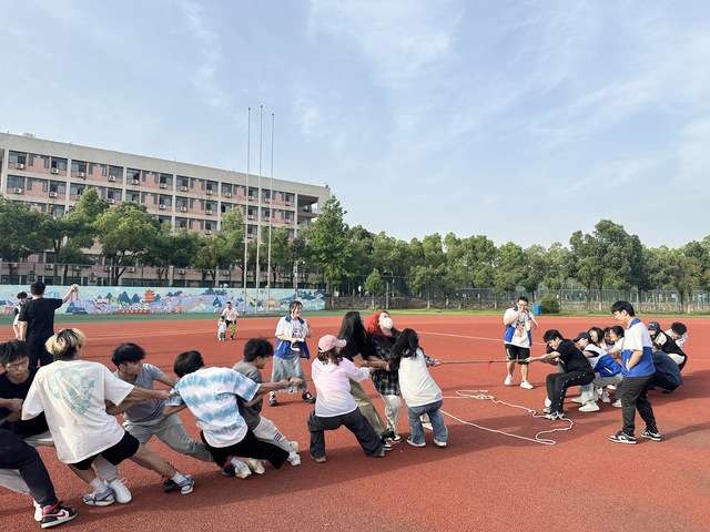 同学们交错而站,拧成一股绳、铆足一股劲,倾全力于一身,集合力于一绳,齐力奋战。他们个个斗志昂扬,紧握长绳,劲往一处使,以热情、积极的精神时刻准备着。“预备!开始!”当裁判员一声令下,拔河比赛正式开始! 大家紧握绳索,发力动作整齐划一,有节奏的向后拉扯,全力以赴,咬紧牙关,为团队荣誉拼尽全力。比赛现场气氛紧张激烈、高潮迭起、激情四溢,充分展现青年学子奋勇拼搏、团结协作、勇争一流的精神风貌。