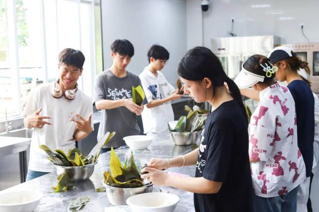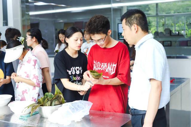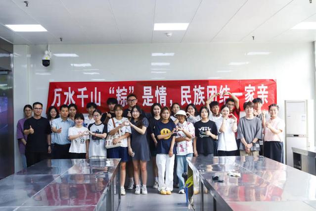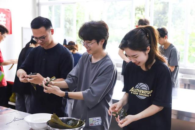 同学们满怀期待的来到实训中心,在烹饪与营养教育专业陈静怡同学的耐心指导下,纷纷动手实践。从选叶、折角、填充糯米和蜜枣,到封口、捆绑,虽然动作略显生疏,但却乐在其中。大家还分享了各自家乡的端午节习俗和文化,交流平日的学习生活,民族团结的情感在小小的粽子中不断升温。