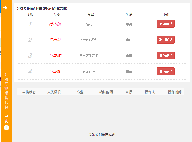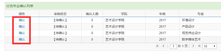 在分流专业确认列表中按照自己的志愿选择专业,并依次点击确认,
