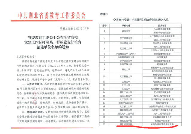 本网讯(通讯员:蔡宁曦 审核:肖家杰)9月28日,湖北省委教育工委公布了全省高校党建工作标杆院系、样板党支部培育创建单位名单。我院党委获批“全省高校党建工作标杆院系”培育创建单位。