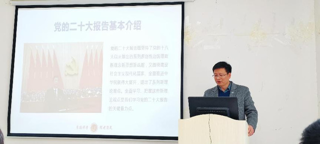 (供稿:蔡宁曦;审核:孙浩)11月15日,党委书记肖家杰在群贤楼103室讲授“用新的伟大奋斗创造新的伟业——全面学习、把握党的二十大报告”主题党课,宣讲党的二十大精神。