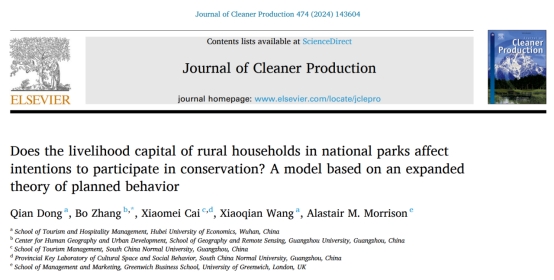 近日,我院董茜博士以第一作者身份在国际权威期刊《Journal of Cleaner Production》上发表了题为《Does the livelihood capital of rural households in national parks affect intentions to participate in conservation? A model based on an expanded theory of planned behavior》的学术论文。该论文由董茜博士担任第一作者,广州大学张博副教授为通讯作者,研究团队还包括华南师范大学蔡晓梅教授、格林威治大学Alastair M. Morrison教授,以及本院王晓倩博士。