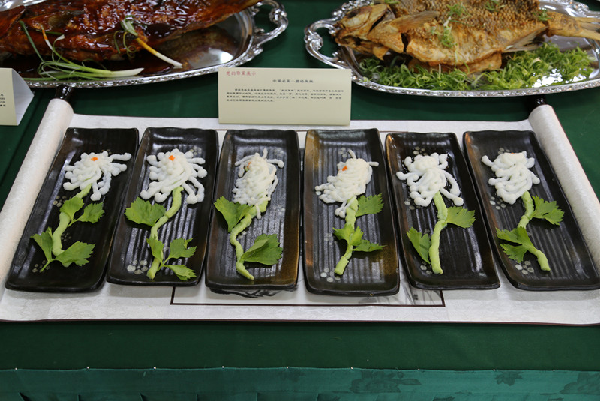 5月16日,以湖北省总工会副主席胡碧辉为团长,卢永良教授带领烹饪大师潘孝强、邹志平、凃军胜、何渊,在台湾嘉义市与台湾海峡两岸劳工发展交流协会共同举办了“鄂台名厨喜相逢,两岸美食一家亲”厨艺交流活动。鄂方以湖北武昌鱼为主要原料制作了“楚韵鄂菜展台”,将琼脂以1%比例雕刻“黄鹤楼”,用金鱼茸制作38层“编钟宝塔鱼糕”,两条6斤重的武昌鱼分别做成“红焖武昌鱼”、“酥鳞武昌鱼”等多道菜肴,色香味形令现场活色生香,充分展示了舌尖上的湖北魅力。