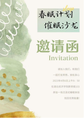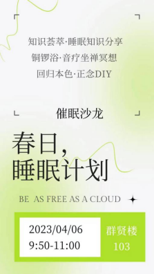 在文超和南伟老师的指导下,学生小组以“春眠计划”为主题,举办了一场沉浸式体验的睡眠沙龙。活动前期,策划小组分工协作策划沙龙环节,制作活动海报,发送邀请函,自学正念打坐冥想方法,准备所需物料,做好应急预案。活动过程中,在主持人的带领下,同学们积极参与互动问答、冥想打坐等环节,活动有序进行。活动结束后,通过复盘,策划小组吸收了来自于老师和同学们的优化建议。