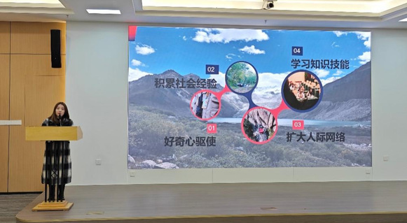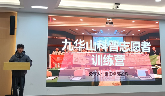 分享会上,秦江峰、郭孟玲两位同学分享了自己的参营见闻及学习体会。秦江峰通过:破冰活动相识队友、同上九华科普考察、以行促学同创设计、展示成果完美结营四个方面介绍了自己在参加志愿者训练营的活动体验,通过简要介绍和图片展示,训练营的项目组成清晰地展示在同学们的面前。随后,郭孟玲以自身经历为引,向同学们介绍了参营期间与专家学者交流的难忘经历和体会收获,激励大家积极主动参与校外实践,“以学促行、以行促知”提升自我综合素质,促进未来长远发展。