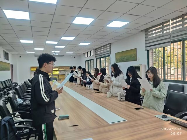 12月4日,学院组织部分团学学生干部参与“宪法晨读”活动。全体参会学生进行宪法晨读,共同诵读宪法原文,体会宪法的深邃内涵和强大力量,同时欣赏第九届全国学生“学宪法 讲宪法”演讲比赛优秀选手声情并茂的演讲,深刻感受“宪法晨读”活动氛围。