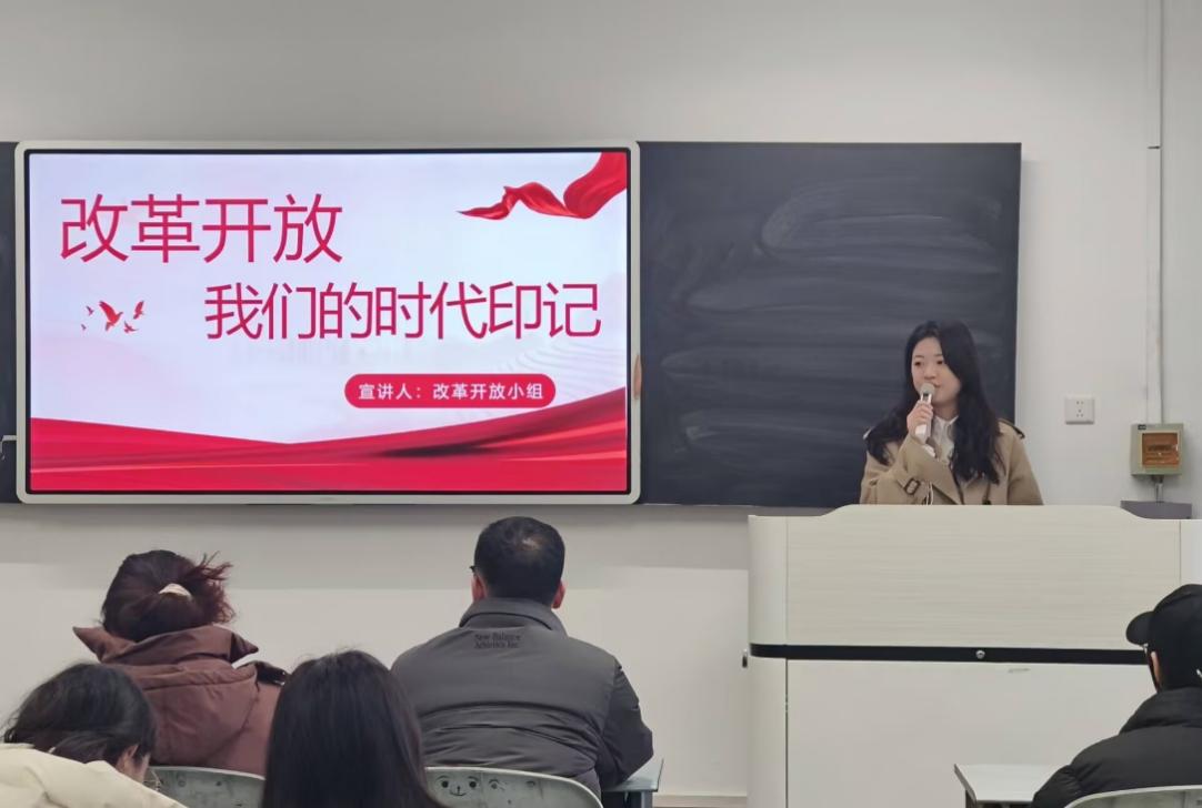 宣讲会现场,赵珠茜通过影像资料,生动呈现小岗村“大包干”契约、深圳蛇口工业区建设、浦东开发开放等历史场景。同时通过一系列典型事例讲述与现场互动,为在场的同学们详细讲解了改革开放的背景为何、几次重要会议的作用是什么、新时代我们改革开放的目标在哪等问题。她呼吁同学们将个人小我投入社会大我的发展之中,为国家、社会贡献自己的一份力量。