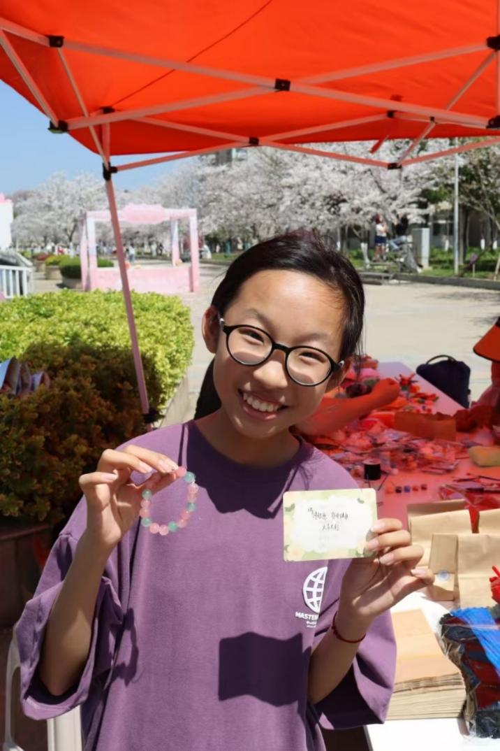 学生们更是创意无限,他们有的用毛线钩针编织樱花书签,针线穿梭间,一朵朵樱花在指尖绽放;有的专注石膏彩绘,将樱花大道的美景定格在石膏娃娃上;还有的制作手链串珠,将春日色彩串成一条流动的风景。完成作品后,大家在小卡片上写下祝福,或分享制作趣事,或表达对接收者的美好期许。盲盒交换环节将活动推向高潮。当一个个装满心意的盲盒在参与者手中传递,樱花大道上充满了欢声笑语。一位学生拆盲盒时惊喜地发现,里面竟是一条以樱花为主题的手链串珠,卡片上写着:“愿这串樱花手链,伴你走过每一个春天。”