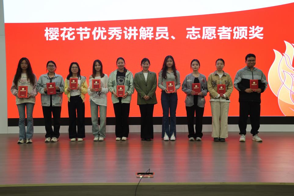 活动设置樱花节优秀讲解员、志愿者表彰环节,两名在樱花节中表现优异的讲解员登台分享。旅游2241班宋家璐和会展2341班邓子玥分别讲述了“如何在实践中提升讲解能力”和“讲解服务过程中的艰辛与收获”,展现了旅院学子服务社会的责任担当。校友谭海平为获奖者颁发证书,肯定其“用专业传递校园温度”的实践精神。