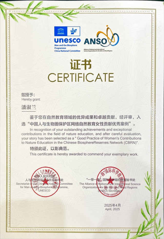(供稿:潘淑兰 审稿:毛焱 ) 我院潘淑兰教授获选“一带一路”国际科学组织联盟(ANSO)和中国人与生物圈国家委员会(中国MAB)联合主办的“中国生物圈保护区网络(CBRN)自然教育女性贡献优秀案例”,并受邀参加4月20日-23日,在联合国教科文组织参与计划(UNESCO Participation Programme)项目的支持下,由“一带一路”国际科学组织联盟(ANSO)和中国人与生物圈国家委员会(中国MAB)联合主办的“中国生物圈保护区网络(CBRN)自然教育女性贡献优秀案例研讨会”。该研讨会在浙江杭州举办,由浙江天目山国家级自然保护区管理局承办,旨在向世界展示女性在中国生物圈保护区网络自然教育领域的突出贡献,搭建经验交流与思想碰撞的平台,助力即将在中国杭州召开的第五届世界生物圈保护区大会。会议得到了生态环境部宣传教育中心、国家林业和草原局宣传中心、中国科学院国际合作局、浙江大学的支持。ANSO秘书处副主任易志军主持开幕式,来自全国的80多名嘉宾、专家及优秀案例代表参会。