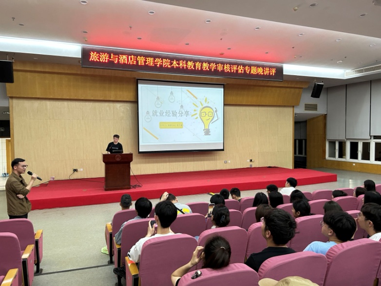 (供稿人:周博 审核:孙浩)为发挥朋辈引领作用,帮助学生明晰就业形势,提高就业能力,促进学生更加充分更高质量就业,5月3日晚,学院在大学生活动中心二号报告厅举办2023届优秀毕业生分享会。活动邀请2023届优秀毕业生向友坤、刘姗、陈立鑫分享求职就业宝贵经验。2024届毕业生及部分低年级学生参加分享会,辅导员周博、李鸽参会。