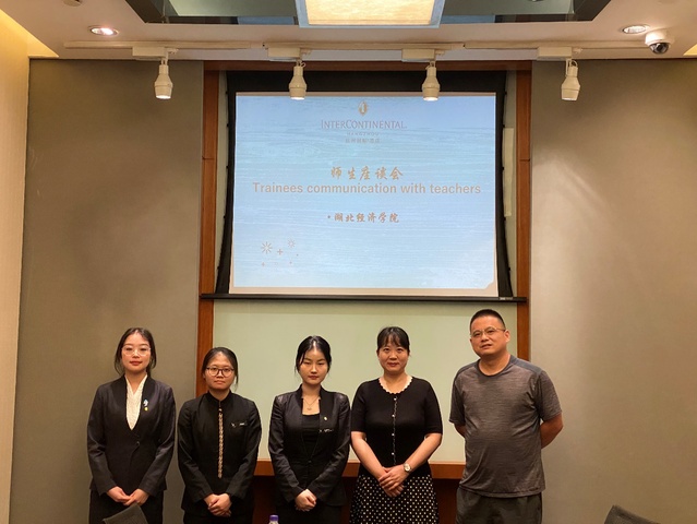 7月12日到13日,两位老师来到了杭州洲际酒店,受到酒店人力资源部吴总监和吴经理的热情接待。两位酒店方代表向毛焱院长介绍了酒店特色以及作为亚运会理事会成员酒店为杭州即将到来的盛会所做的准备工作情况。在与学生的座谈会上,毛焱院长详细了解了学生在预订部、行政酒廊和宴会部的实习工作及收获,并对学生后期实习提出了要求。最后,两位老师探访了在该酒店任预订部主管的优秀校友雷顺敏。