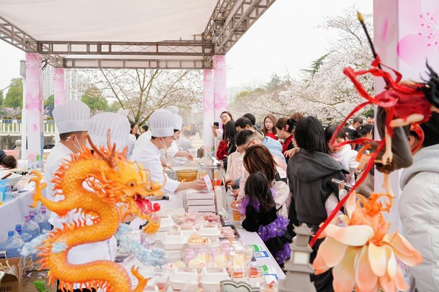 本届樱花市集活动共有25个摊位,包括特色美食、摄影服务、手作艺术品DIY体验、社团文化展演、文创商品等5类区域,融校园青春活力与春日美好体验于一体。我校楚菜现代产业学院“楚菜非遗”展台集结楚菜美食,带来了沔阳三蒸、鱼丸、樱花糕等特色美食体验,展台前人头攒动,成为市集最热闹的一角。摄影服务摊位推出樱花主题摄影套餐,定格花与人的美好瞬间;文创商品摊位汇集湖经官方文创、樱花陶瓷摆件等特色好物,尽显校园文化;手作艺术品DIY体验区开设扭扭棒樱花花束、艾草樱花香囊等体验项目,让游客在手工创作中感受春日乐趣。这些各式各样的特色摊位前挤满了前来体验的游客,在创意手作与趣味互动中,共同感受校园美好。