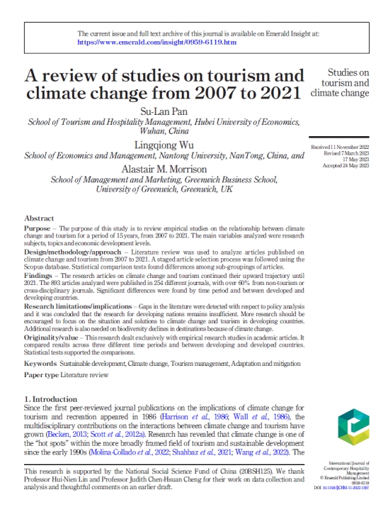 (供稿:潘淑兰 审核:陈立双)太阳集团官网8722教师潘淑兰博士为第一作者的论文“A review of studies on tourism and climate change from 2007-2021”在《International Journal of Contemporary Hospitality Management》线上发表,目前已被SSCI收录。
