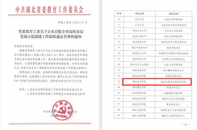 本网讯(通讯员:李鸽 审核:孙浩)12月1日,湖北省委教育工委公布了首批全省高校基层党建示范创建工作验收通过名单,我院党委顺利通过“全省高校党建工作标杆院系”培育创建单位验收。