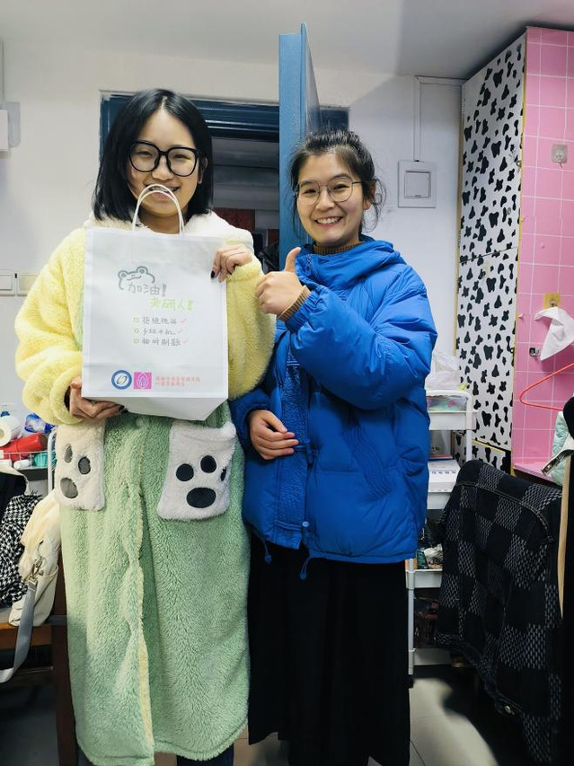活动期间,辅导员老师带着礼物,来到每位考研学生寝室,送去装满了温暖与鼓励的备考大礼包。大四同学对老师们的到来非常惊喜,满是感动,纷纷表示:非常感谢学院、老师的祝福,学习的疲惫一扫而空,未来十天拼尽全力,不留遗憾。